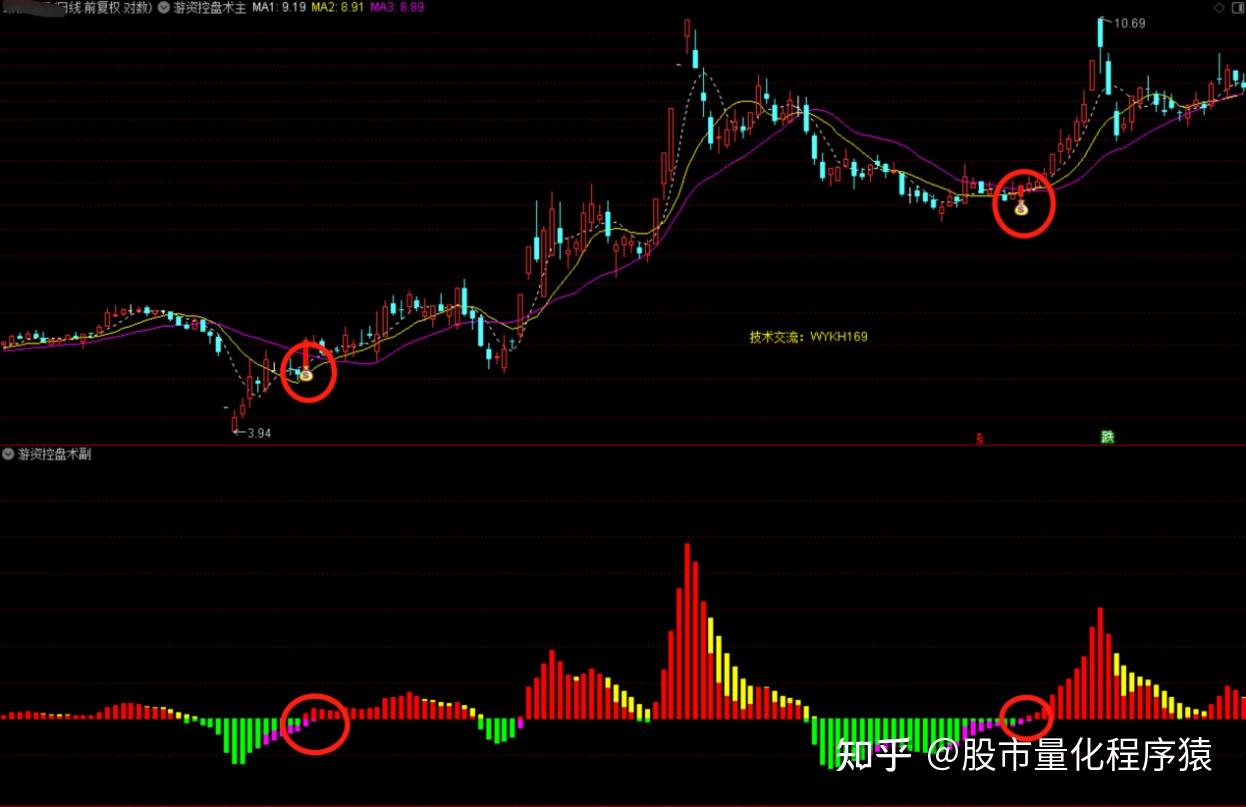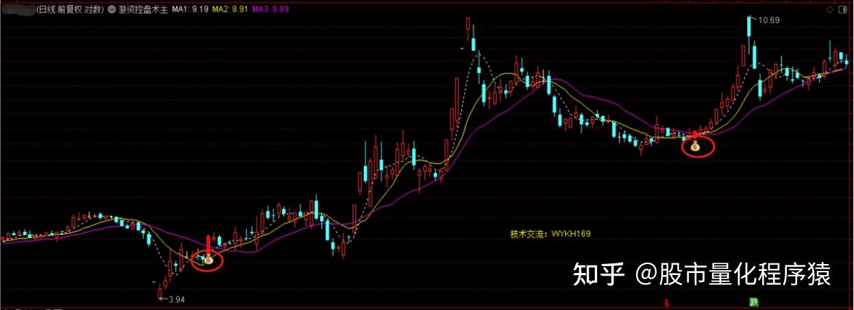 2、它对应副图中的红色主力做多信号;但并不是每个红色做多信号都会出现钱袋子,必须是”主力做多+趋势多头“共振产生的信号。