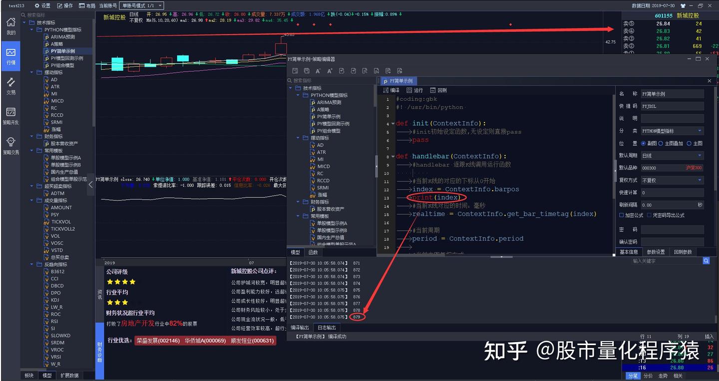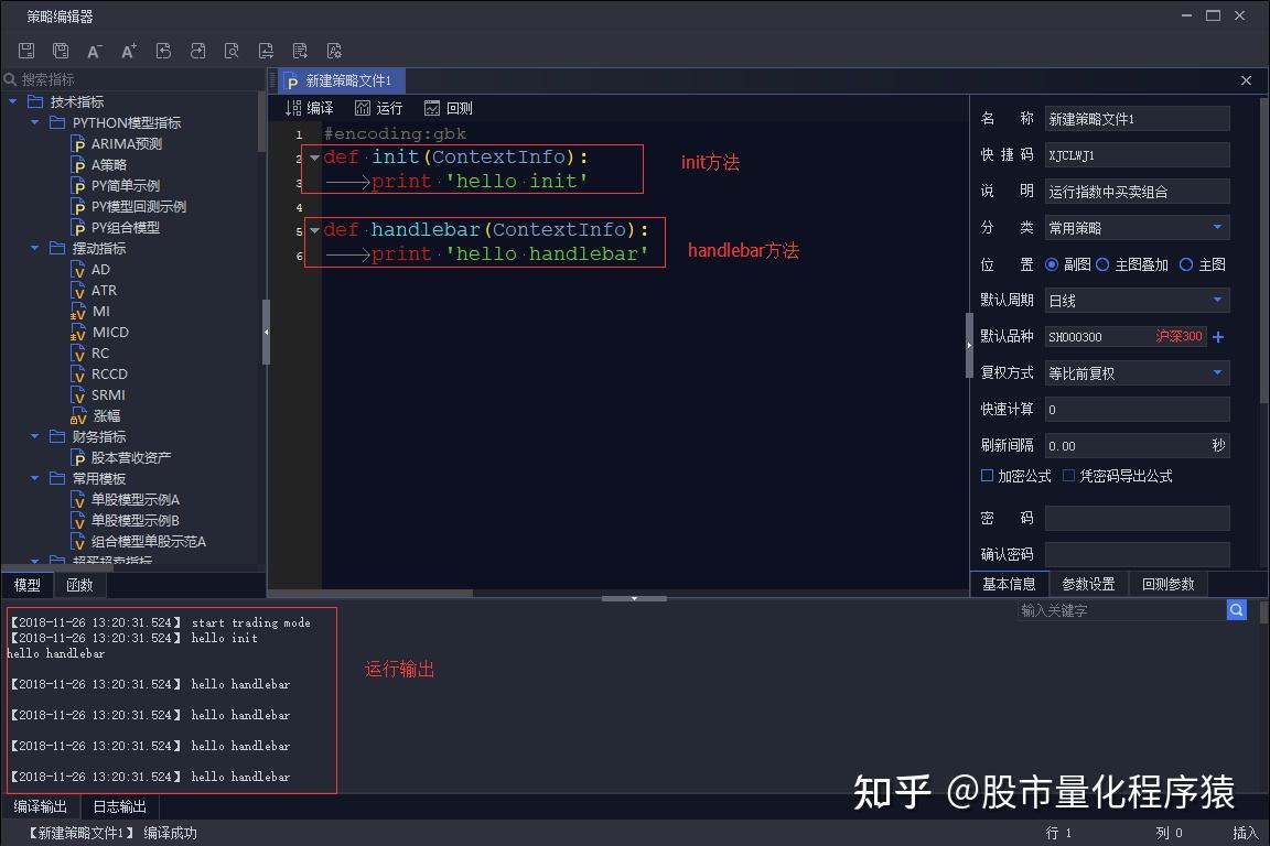 上图展示了如何在平台上用 Python 写一个输出 hello world 的模型。图中的模型实现了一个 Python 模型必须实现的两个接口:init与handlebar。输出窗口展示了这个模型的运行输出。系统首 先调用 init 方法输出了hello init,随后在每根 K 线上调用一次 handlebar,输出一次 hello handlebar。