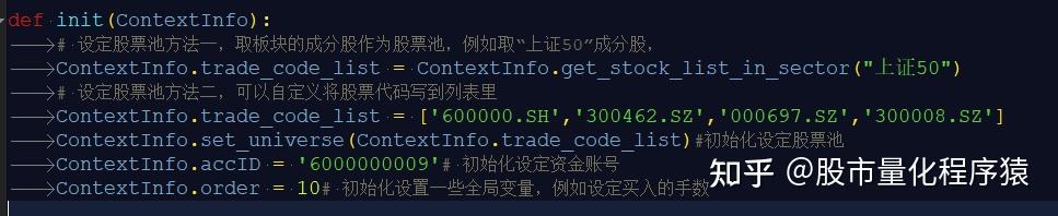 init 是 Python 的初始化方法,负责初始化模型运行所需的初始变量,如对于基准 benchmark 和股票 池 universe 的初始化。