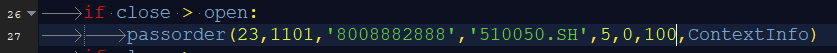 如上图,当盘中运行到最后一根 K 线的时候,每个 tick 数据来时都会判定一下这个条件是否成立,当不 是这根 K 线的最后一个 tick,之前的所有的 tick 成立的产生的信号就是虚的信号。只有当这个 K 线确定 时,产生的信号才是有效信号,才会触发下单。