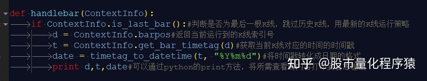 handlebar 是 Python 的核心执行函数。在 K 线图(目前尚不支持分时图)上运行时会根据主图的时间 轴,每个时间点会进入相应的 handlebar 方法,可在 handlebar 中使用 ContextInfo.barpos 来获取当 前的 bar 索引位置。