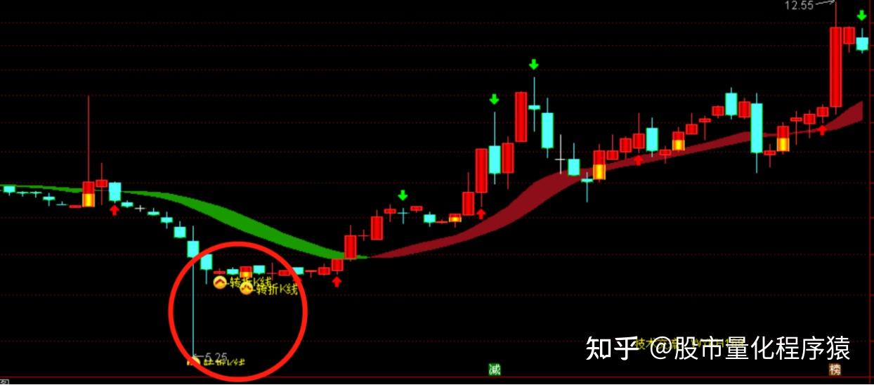 转折K线:=ABC6 AND CROSS(ABC7,MA(ABC8,6)),COLORRED,NODRAW;DRAWICON(转折K线,L,34);