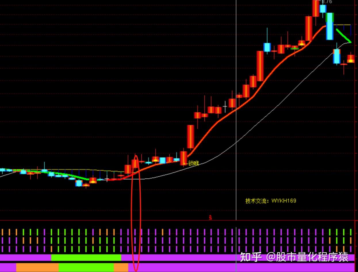 F60B:=MIN(EMA(C,20),EMA(C,31));STICKLINE(C>F60A,2.3,3,0.5,0),COLORFF33CC,LINETHICK2;