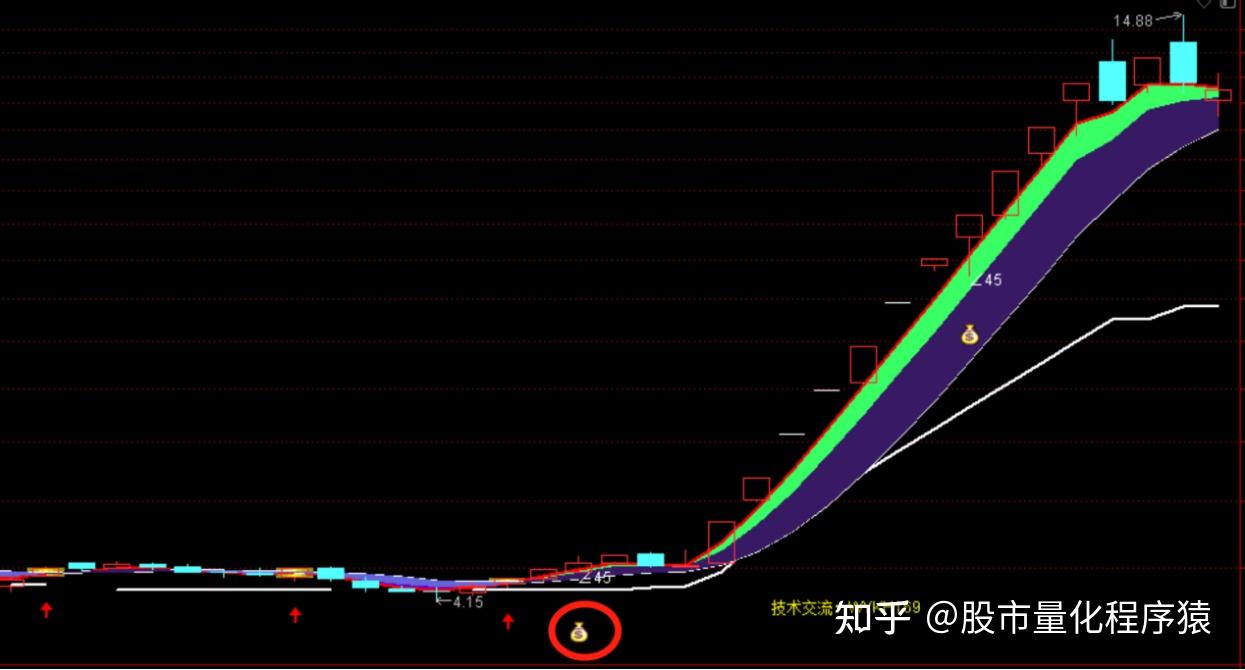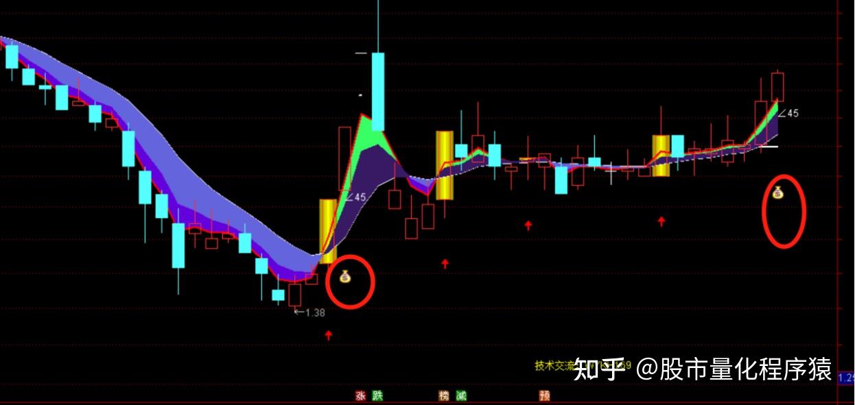 庄家45度上涨钱袋子买入信号彩带通达信主图指标公式