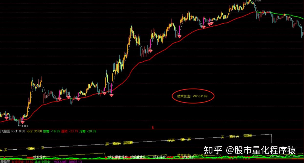 XT_3:=IF(MA(CLOSE,17)< XT_2,XT_2,MA(CLOSE,17));DRAWTEXT_FIX(1,0.60,0.75,0,'技术交流:WYKH169 '),COLORYELLOW;